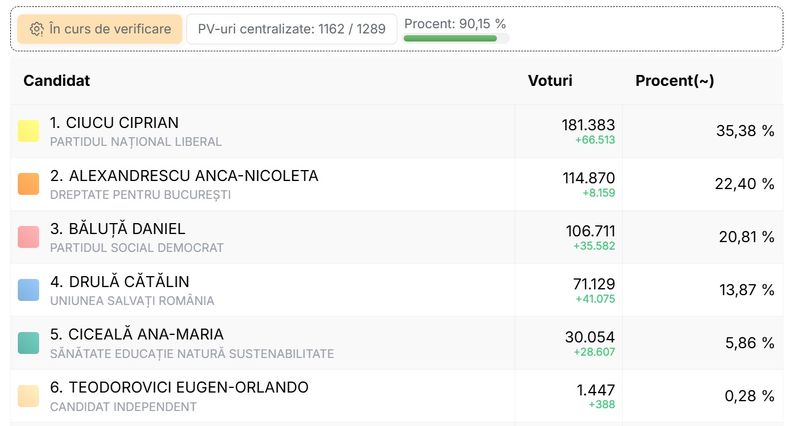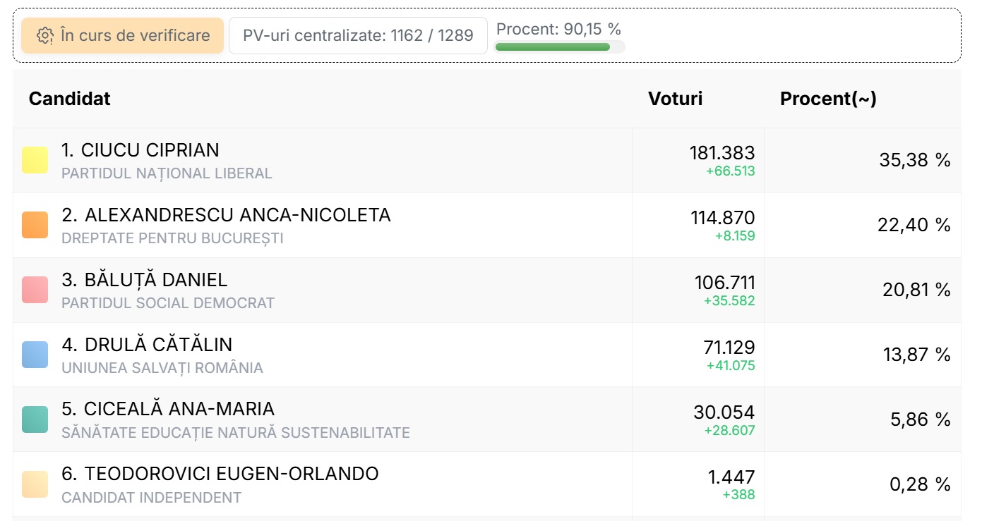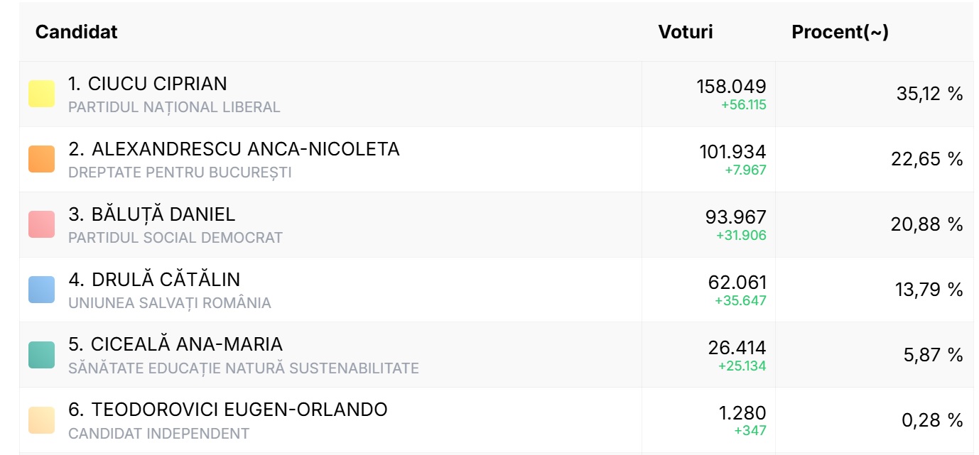 UPDATE 24.00. După aproape 99% din totalul proceselor verbale, Ciprian Ciucu (PNL) a obținut 36% din voturi, urmat de Anca Alexandrescu (independentă sprijinită de AUR şi