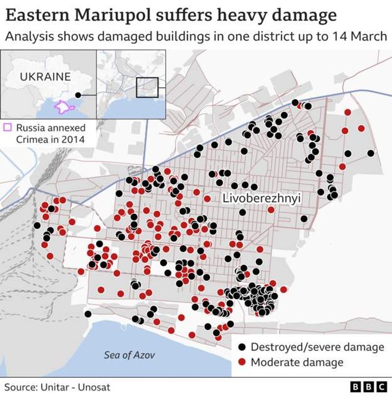 Rusia a lovit în Mariupol mai multe adăposturi civile, școli, un spital și un teatru. Ucraina a spus că atacurile rușilor sunt crime de război care vor rămâne în istorie.