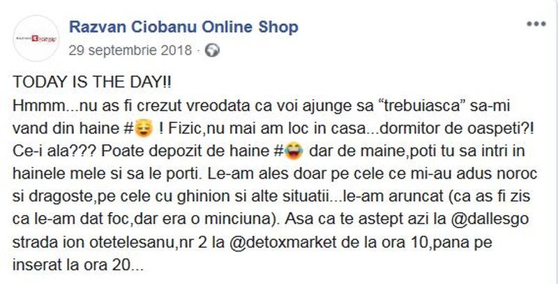 Postarea apare pe site-ul magazinului online pe care Ciobanu îl deschisese la sfârșitul anului 2017. A fost ultima încercare a lui Răzvan de a reveni în prim-planul industriei de fashion.