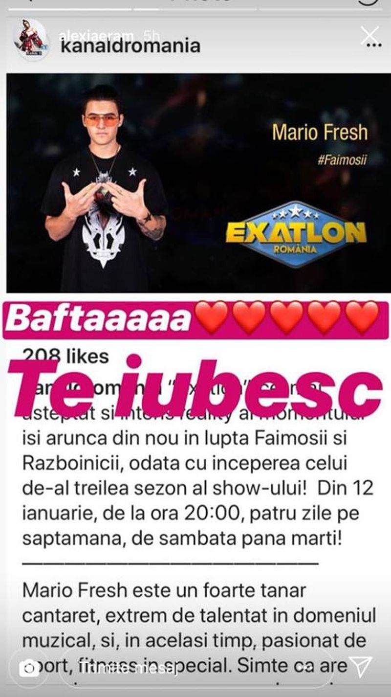 Alexia Eram, fiica Andreeai Esca și iubita lui Mario Fresh, a transmis și ea un mesaj de încurajare pentru iubitul ei. Nu a folosit multe cuvinte, dar le-a folosit pe cele mai importante ”Baftă!Te iubesc!”.