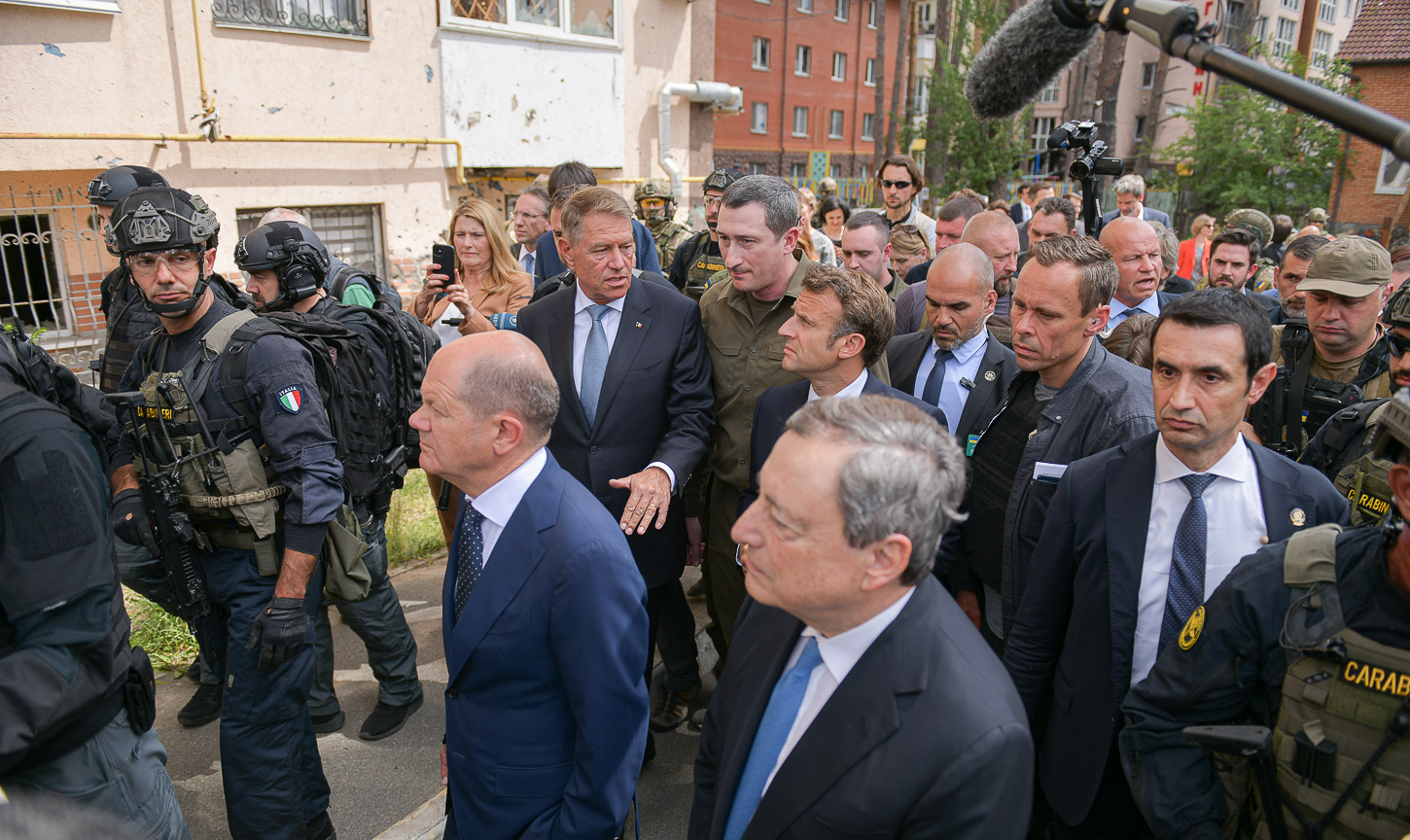Emmanel Macron, Mario Draghi, Olaf Scholz și președintele României Klaus Iohannis au mers joi într-o vizită oficială la Kiev, acolo unde vor avea discuții cu oficialii ucraineni și președintele Volodimir Zelenski. Cei patru lideri europeni au vizitat și suburbia capitalei Irpin, locul unde soldații ruși au masacrat populația civilă.