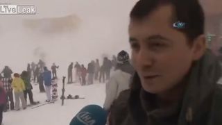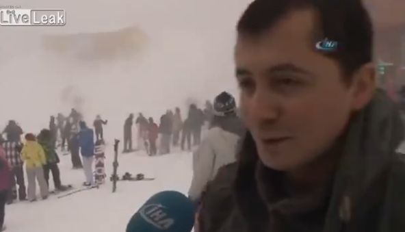 Un manager de hotel, care dadea un interviu pe partie pentru un post de televiziune locala, a avut o reactie incredibila cand a vazut o avalansa care venea spre clientii lui.