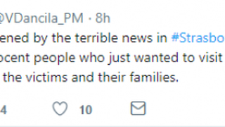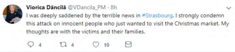 ”Am fost profund întristată de informaţiile îngrozitoare de la Strasbourg. Condamn cu fermitate acest atac asupra oamenilor nevinovaţi care voiau doar să viziteze târgul de Crăciun. Gândurile mele sunt alături de victime şi de familiile lor", scrie premierul.