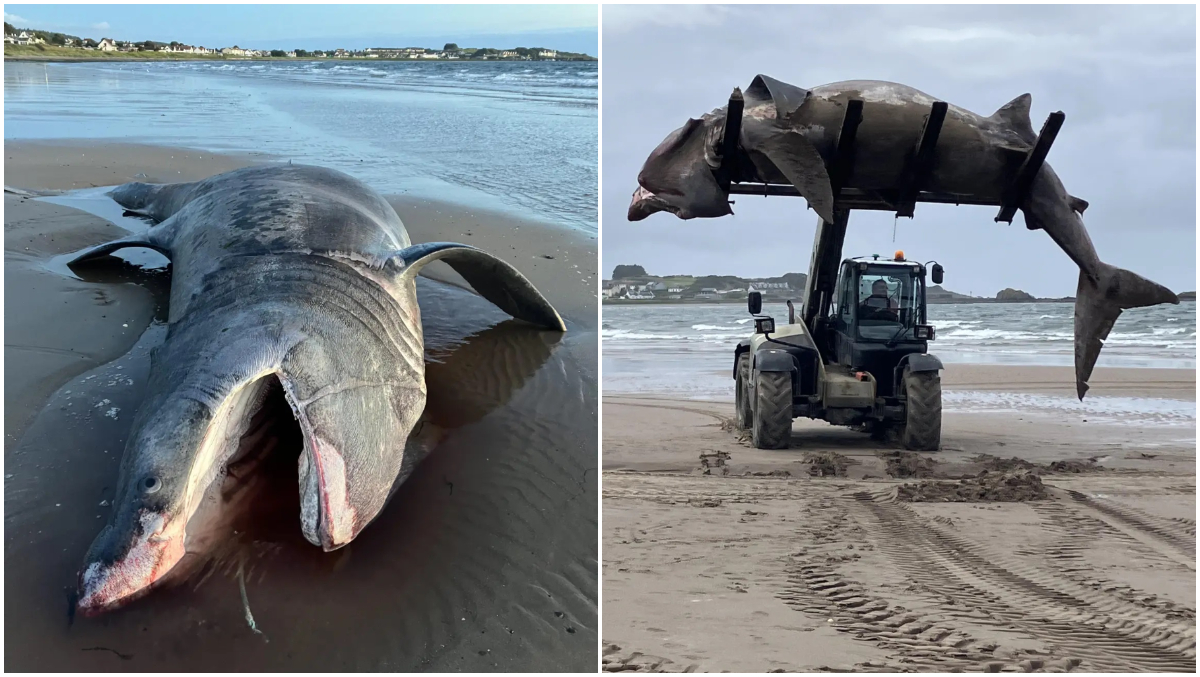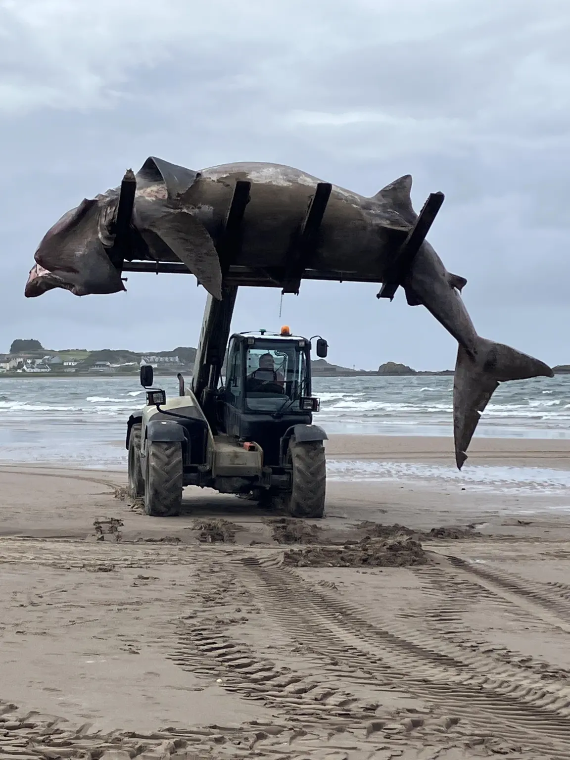 Un rechin lung de 7,5 metri a eșuat pe o plajă din Regatul Unit în weekend și a fost nevoie de un moto-stivuitor pentru a muta fiara masivă de pe țărm, după cum arată fotografiile publicate.