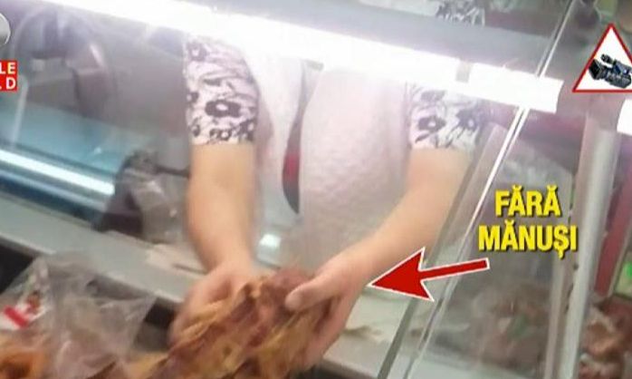 Intr-o hala de carne din Galati, bucatile de carne sunt intoarse pe toate partile cu mainile goale! Mana ajunge apoi pe casa de marcat, pe portofel, bani... si tot asa.