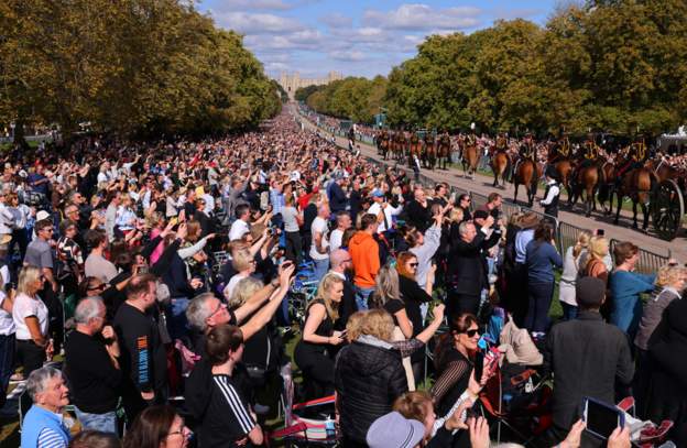 UPDATE 16.15. Zeci de mii de oameni îi aduc un ultim omagiu Reginei Elisabeta pe drumul care leagă Westminister Abbey de Castelul Windsor: