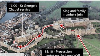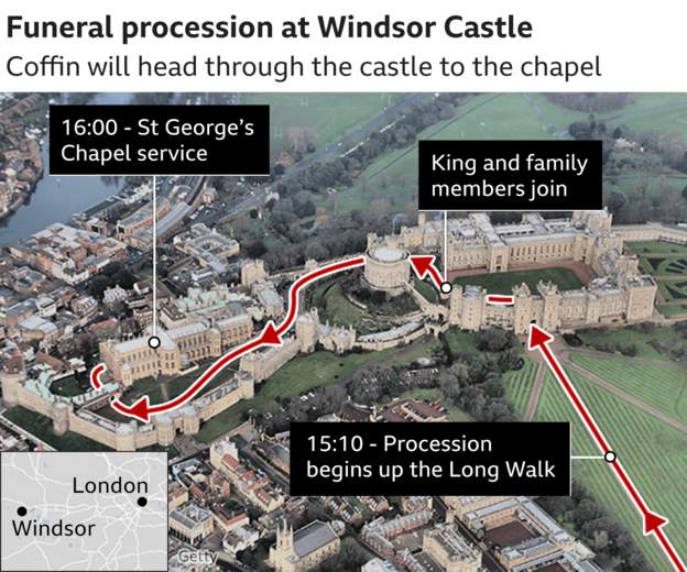 Dricul funerar se va îndrepta la Castelul Windsor pentru o slujbă la Capela St George, la ora 16:00 BST (18.00, ora României). Sunt așteptați în jur de 800 de invitați, un eveniment la scară mai mică decât cel de la Westminster.