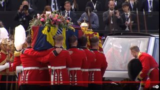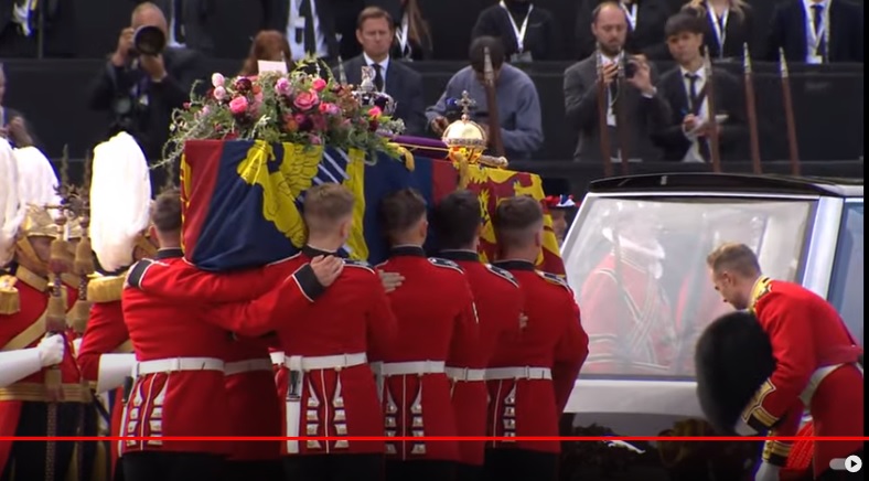 UPDATE 15.30. După încheierea slujbei funerare, sicriul Reginei a fost plasat din nou în Dricul funerar de stat. Soldații care desfășoară operațiunea fac parte din Batalionul 1 a Gărzii de Grenadieri.