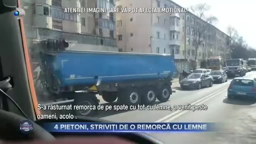 Patru oameni care se plimbau pe stradă au fost la un pas de moarte, după ce lemnele dintr-o remorcă s-au răsturnat pe trotuar