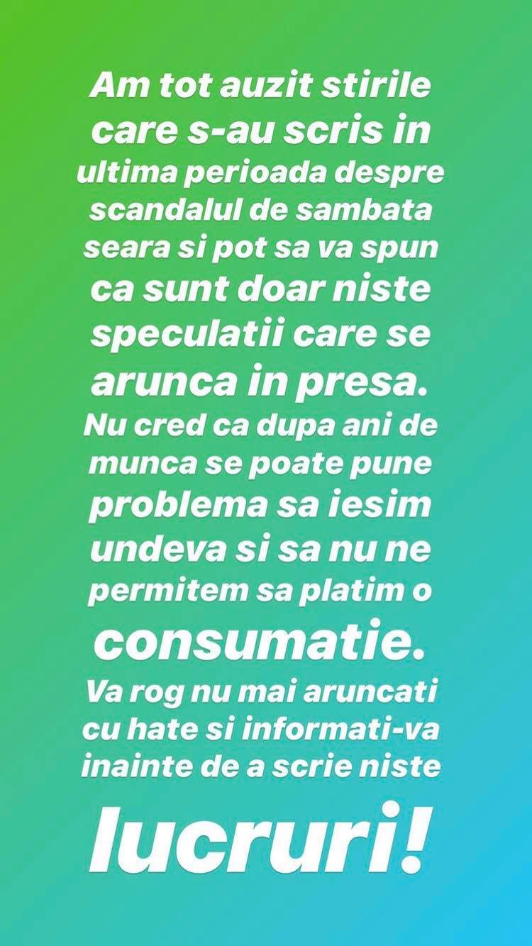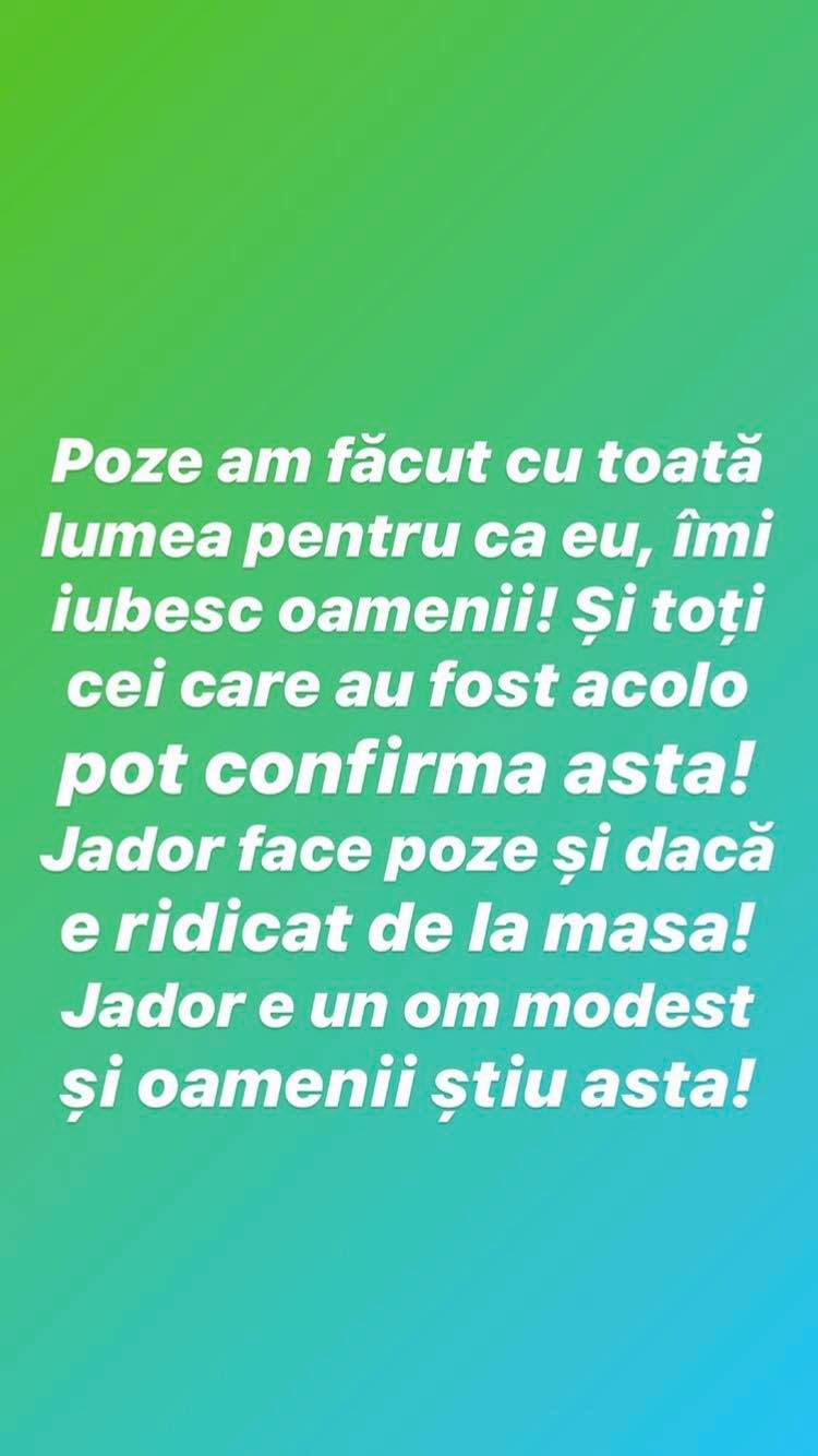 „Am tot auzit știrile care s-au scris în ultima perioadă despre scandalul de sâmbătă seara și pot să vă spun că sunt doar niște speculații care se aruncă în presă. Nu cred că după ani de muncă se poate pune problema să ieșim undeva și să nu ne permitem să plătim o consumație. Vă rog nu mai aruncați cu hate și informați-vă înainte de a scrie niște lucruri!” a declarat Jador de la „Puterea Dragostei”.