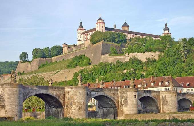 Wurzburg, vedere de sus Wurzburgul este un orasel bavarez de 125.000 de locuitori, situat intre Frankfurt si Nuremberg. Este linistit, elegant si incarcat de istorie. Cand cobori din tren, in gara, si patrunzi pe stradutele orasului, ai o senzatie stranie, de cetate medievala. Fortareata Marienberg, cu vechiul pod principal in fata.