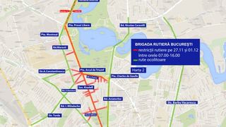 Joi, in intervalul orar 04.00- 16.00, este fi inchisa circulatia pe axul central al Soselei Kiseleff si pe banda I de circulatie, pe tronsonul cuprins intre Piata Presei Libere si Piata Arcul de Triumf, pe banda I pe Soseaua Bucuresti-Ploiesti, sensul de mers Piata Presei Libere catre Fantana Miorita, precum si pe banda IV a Soselei Bucuresti-Ploiesti, sensul de mers Fantana Miorita catre Piata Presei Libere, potrivit Brigazii Rutiere a Capitalei, relateaza News.ro.