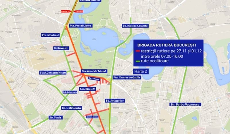 este restrictionat traficul rutier pe banda I de circulatie pe Bulevardul Aviatorilor, dinspre Bulevardul Beijing catre Strada Arhitect Ion Mincu si, la necesitate, pe banda I pe sensul de mers dinspre Strada Arhitect Ion Mincu catre Bulevardul Beijing.Rutele ocolitoare recomandate de politisti sunt urmatoarele: