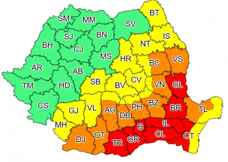 În cursul zilei de miercuri, codul roșu vizează județele Teleorman, Giurgiu, Ilfov, Călărași, Ialomița, Brăila și Galați, vestul județului Constanța și municipiul București. Temperaturile maxime vor fi de 40- 42 de grade, iar disconfortul termic va fi deosebit de accentuat.