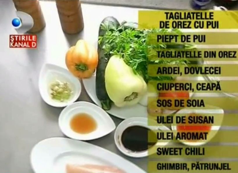 Bucataria asiatica e ca un templu ale carui secrete doar initiatii le cunosc... Le puteti afla si dumneavoastra, trebuie doar sa aveti la indemana ingrediente care vor transforma preparatul intr-un deliciu aromat si gustos: piept de pui, tagliatelle din orez, ardei, dovlecei, ciuperci, ceapa, sos de soia, ulei de susan, ulei aromat cu lemongrass, sweet chili, ghimbir, patrunjel, sare si piper.