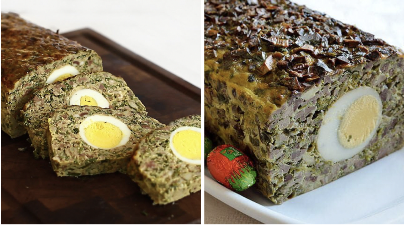 Ulterior se pune o parte din umplutură peste prapur în formă. Se așează apoi ouăle fierte, întregi sau jumătăți, apăsând ușor.