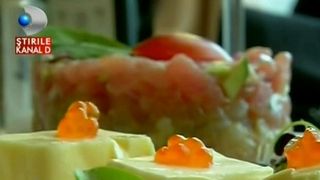"Ne trebuie ton rosu, avem un file de biban, avem creveti, pentru tartar ne trebuie o ceapa rosie, un castravete, ne trebuie un pic de unt pentru ca se serveste crud pe paine prajita"