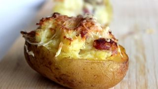Iată o reţetă de cartofi umpluţi cu telemea şi şuncă, un fel de mâncare extrem de simplu de realizat şi extrem de gustos.
