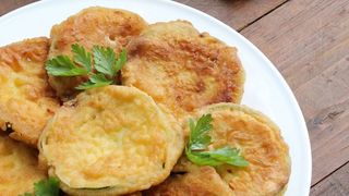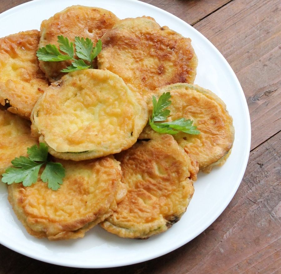 Încinge ulei într-o tigaie, cam până la jumătatea ei și lasă-l la încins. Dă fiecare feliuță de dovlecel prin făină, apoi prin ou și prin pesmet și pune-le pe toate la prăjit. Scoate feliuțele de dovlecel pe o farfurie pe care ai pus un șervețel absorbant, ca uleiul să se scurgă.