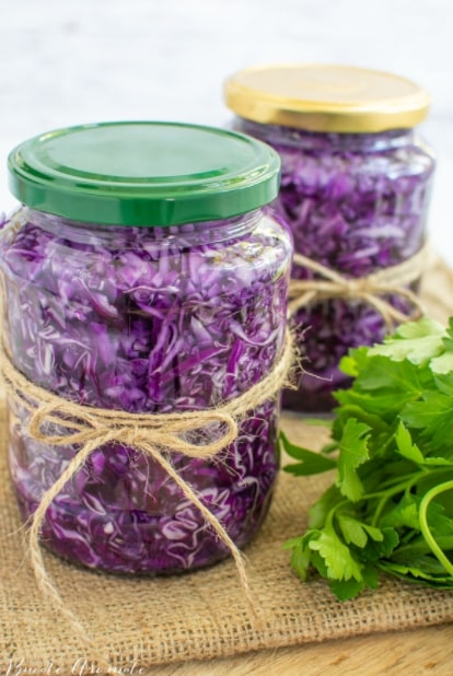 Așadar, pe fundul unui borcan punem 1 frunza de dafin, 2 -3 rondele de hrean si cateva boabe de piper. Punem varza in borcane in straturi alternative din cea alba cu cea rosie, avand grija sa strecuram cimbrul intre intre aceste straturi, pe la mijlocul borcanului. După care, punem deasupra telina, hreanul, mararul uscat, boabele de mustar si cateva boabe de piper.