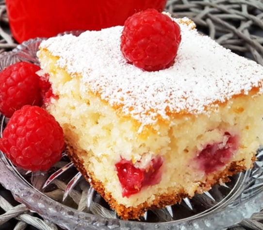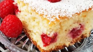 După care, peste aluat se așază uniform zmeura. Se coace prăjitura la 180 de grade Celsius timp de aproximativ 20 de minute, sau până trece de testul scobitorii.