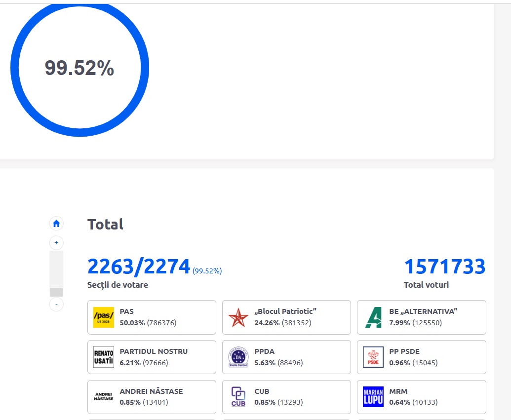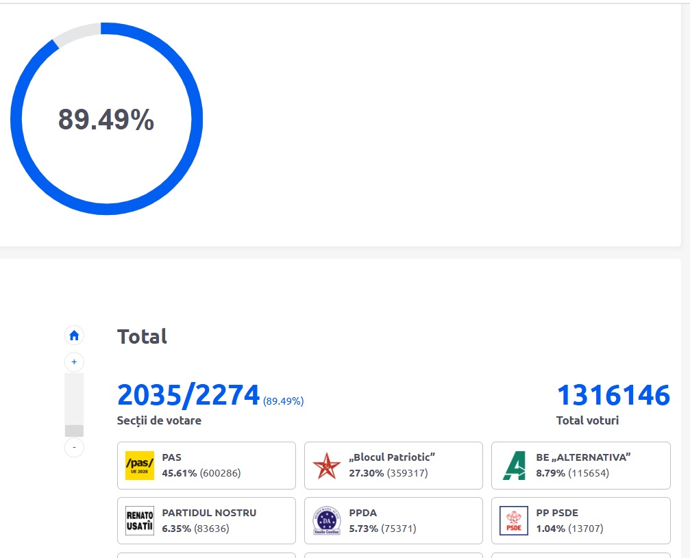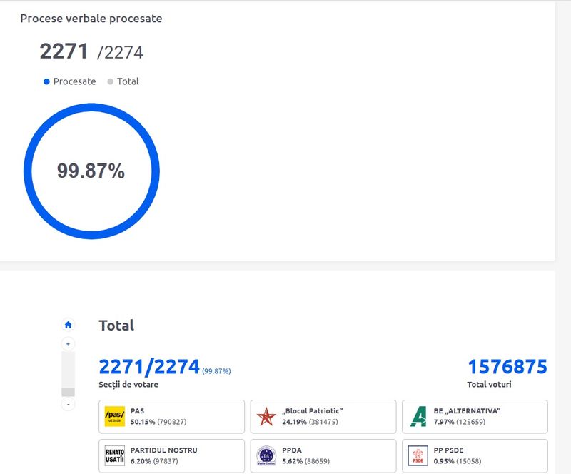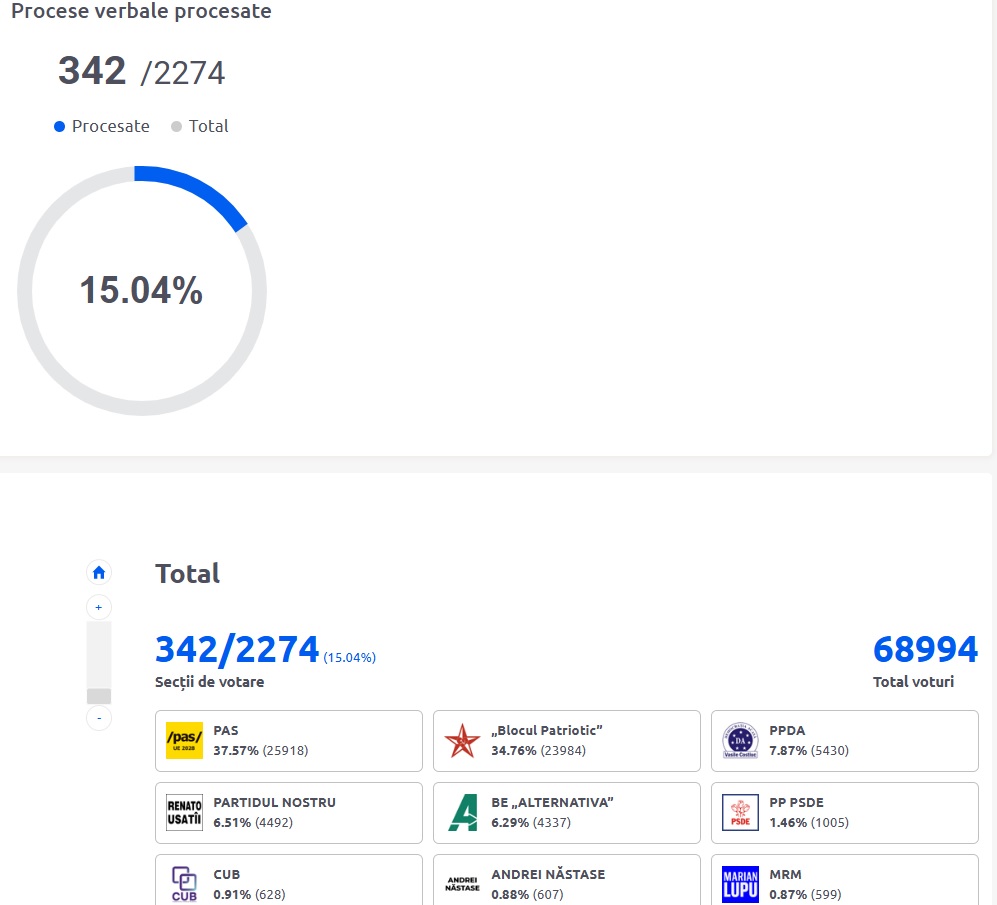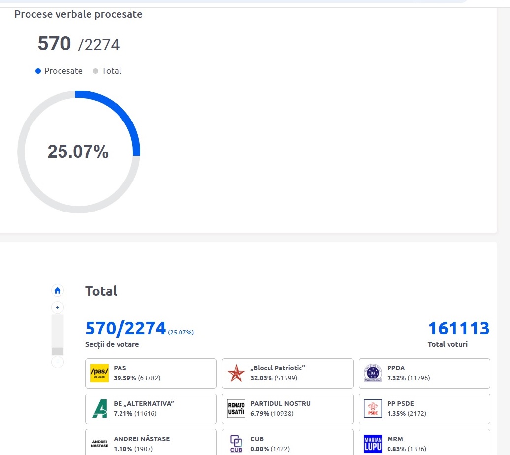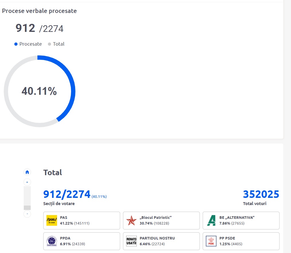 Astfel, potrivit datelor în timp real publicate de CEC.md, PAS a obținut 39,5%, Blocul Patriotic are 32% din voturi, PPDA (7,3%) și Blocul electoral "Alternativa" (7,2%).