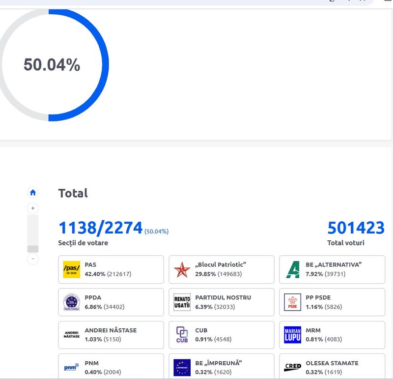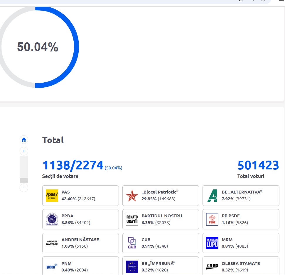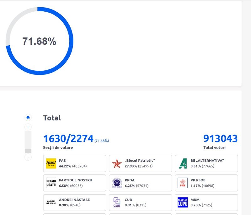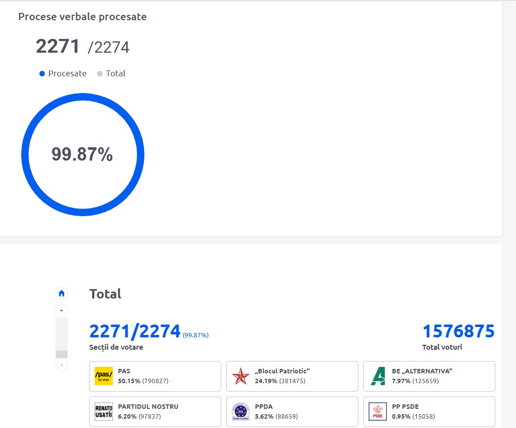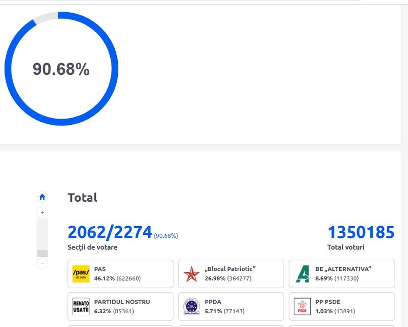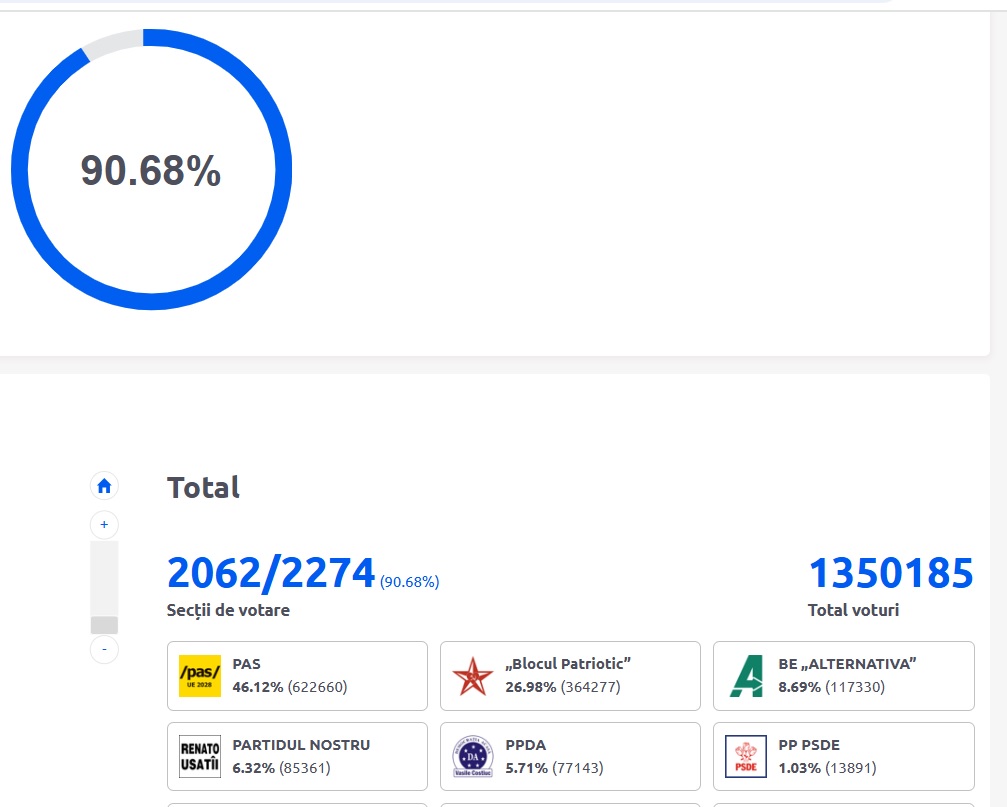 Astfel, potrivit datelor în timp real publicate de CEC.md, PAS a obținut 39,5%, Blocul Patriotic are 32% din voturi, PPDA (7,3%) și Blocul electoral "Alternativa" (7,2%).