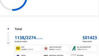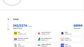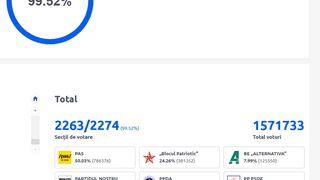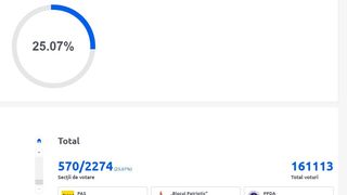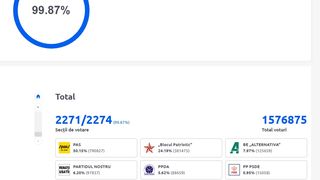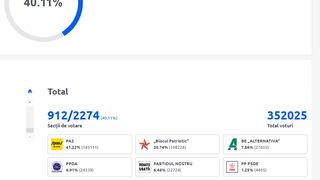 Au fost numărate voturile din 912 de secții de votare din totalul de 2274 procese verbale, care reprezintă 40,11% din total, iar rezultatele arată în felul următor:Care sunt rezultatele după centralizarea a 25% din voturi