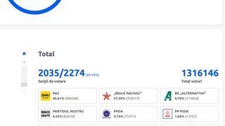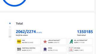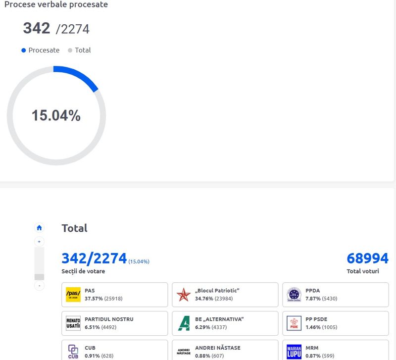 După centralizarea a 15% din procesele verbale, PAS conduce cu 37% din voturi, urmat de Blocul Patriotic (34%), PPDA (7,8%) și Partidul Nostru (6,5%), potrivit site-ului Comisiei Electorale Centrale. Vezi datele preliminare în timp real aici.