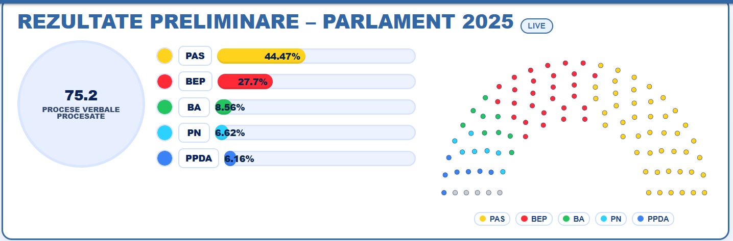 Rezultatele alegerilor parlamentare din Republica Moldova 2025 arată victoria detașată a Partidului pro-european al Maiei Sandu, PAS. Miza principală a fost obținerea majorității în Parlament, pentru a nu permite formațiunilor pro-ruse conduse de Blocul Patriotic să deturneze traseul Moldovei în sfera de influență a Rusiei. Numărarea voturilor a fost publicată în timp real pe site-ul Biroului electoral central de la Chișinău, iar voturile din diaspora au făcut diferența pentru păstrarea opțiunii de aderare la UE și îndepărtare de Rusia.