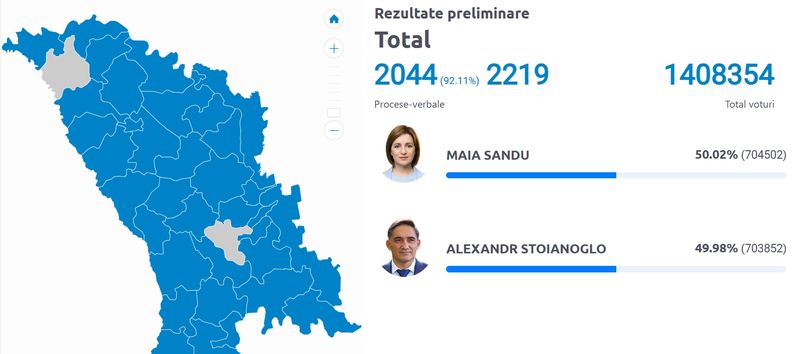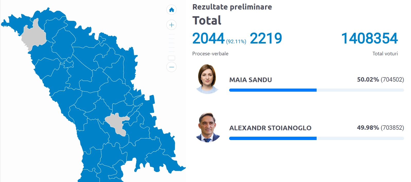Maia Sandu a obținut peste 50,15% din voturi, iar diferența crește în fața adversarului său Alexandr Stoianoglu, care a obținut 49,8% din voturi. Este de așteptat ca diferența să crească în favoarea candidatei pro-europene.