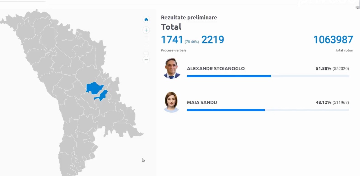 După numărarea a 78% din procesele verbale, reprezentând 1,06 milioane buletine de vot, Alexandr Stoianoglo are 51,88% din voturi, iar Maia Sandu 48,06%.