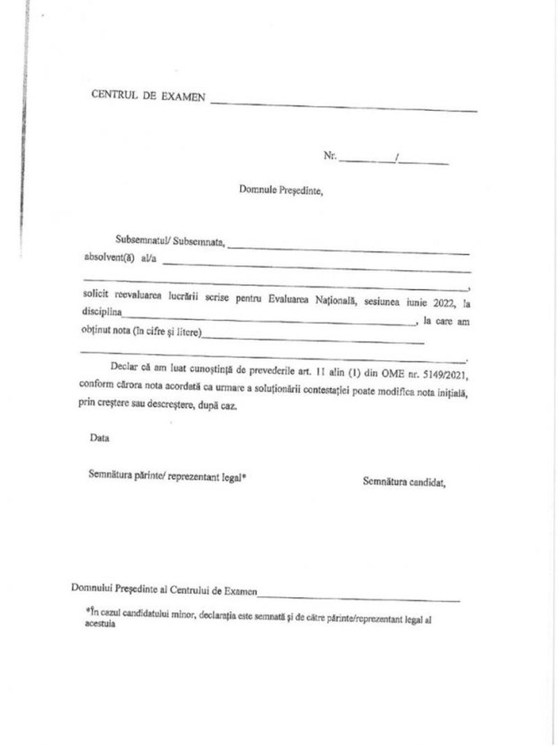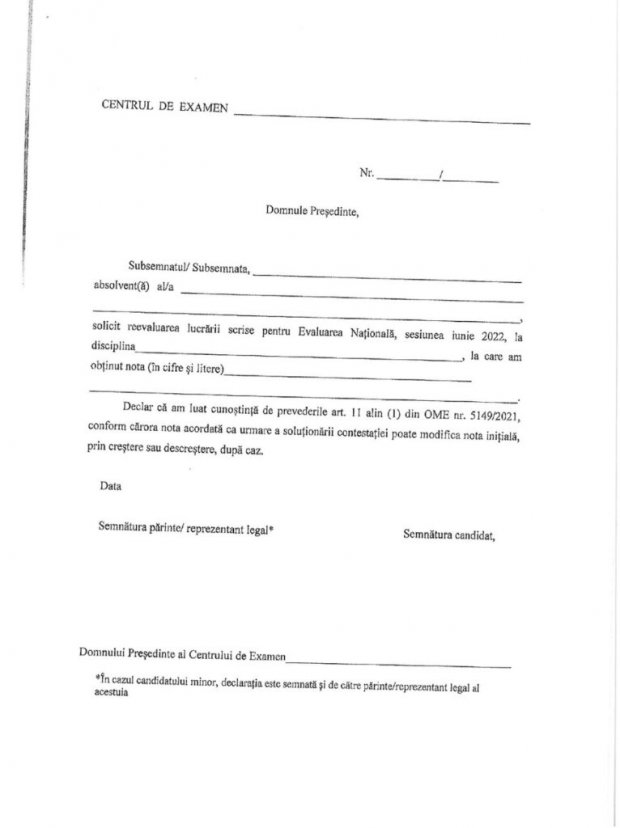 Elevii care vor să depună contestații trebuie să completeze și să semneze o cerere care conține și o declarație-tip, în care elevii menționează faptul că au luat la cunosțință că nota