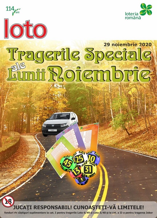 Duminica, 29 noiembrie, au avut loc tragerile speciale LOTO ale lunii noiembrie, anunță Loteria Română. Pentru aceste trageri, Loteria Romana suplimenteaza fondurile de castiguri ale jocurilor Loto 6/49, Joker si Loto 5/40 dupa cum urmează: