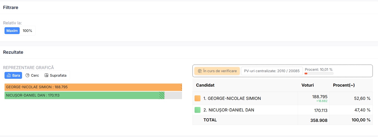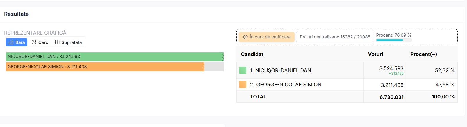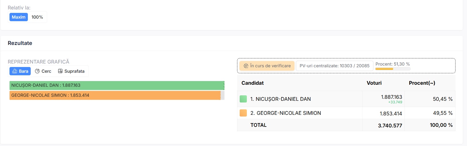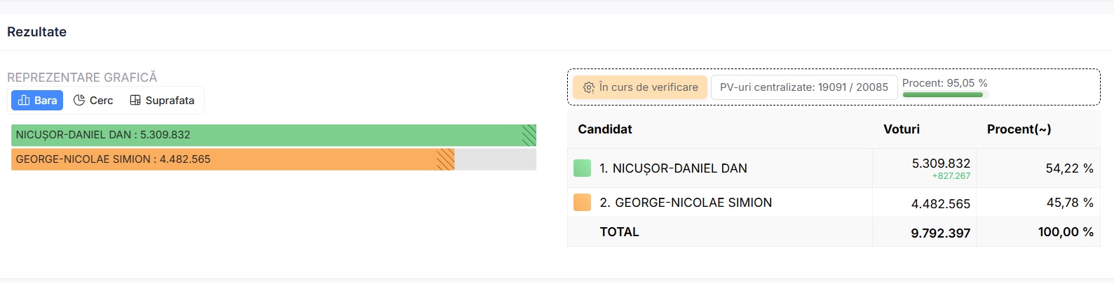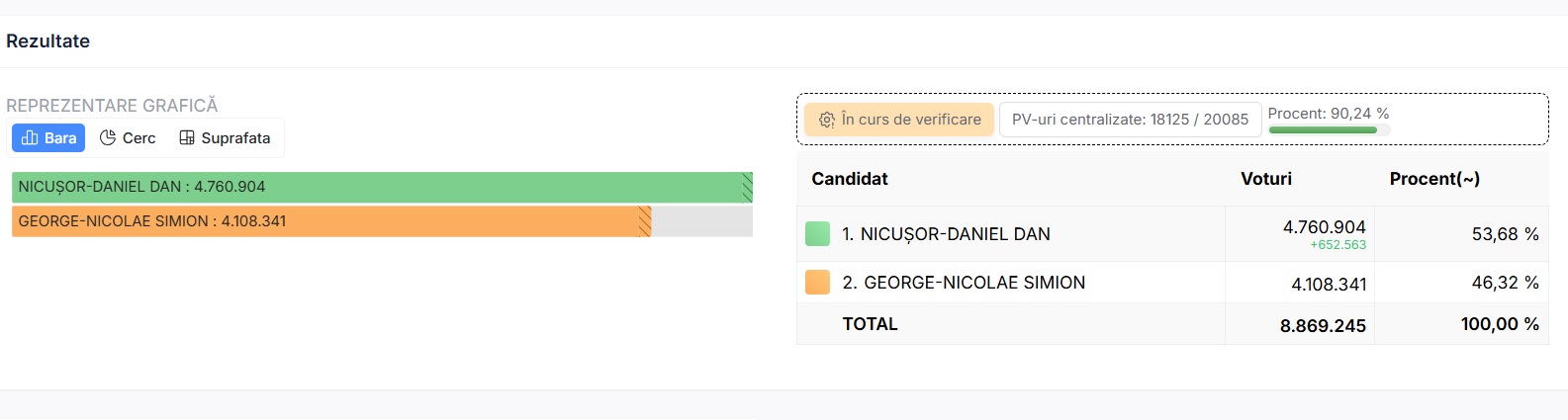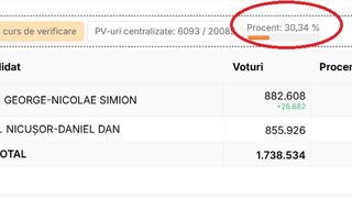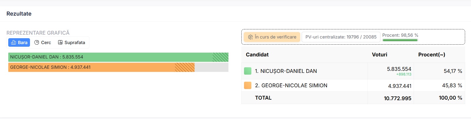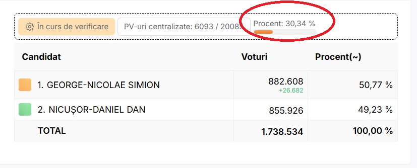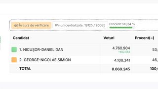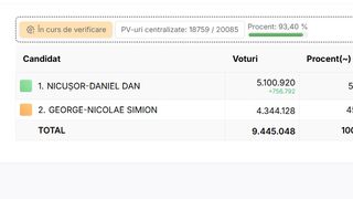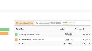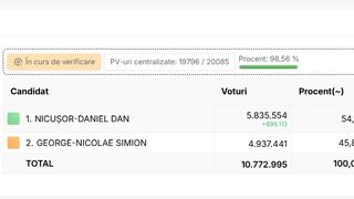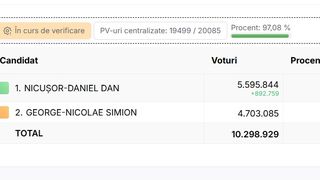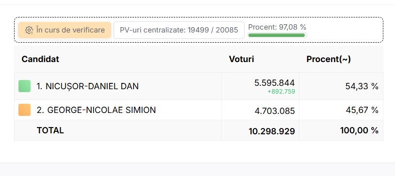 După centralizarea a 98,5% din totalul secțiilor de vot, Nicușor Dan are 54,17% din voturi, spre deosebire de George Simion care a obținut doar 45,83%. Nicușor Dan are aproape 900 de mii de voturi în plus față de candidatul AUR, în timp ce mai sunt de numărat peste 800 de mii de buletine de vot.