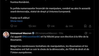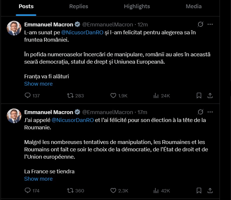 Președintele Franței, Emmanuel Macron, a trasmis, duminică noaptea un mesaj în limba română pe X.com în care îl felicită pe Nicușor Dan pentru câștigarea alegerilor din România și spune că românii au ales statul de drept și UE.