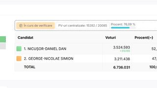 Per total, după ce s-au numărat peste 8,6 milioane de voturi, Nicuşor Dan conduce cu 53,6%.