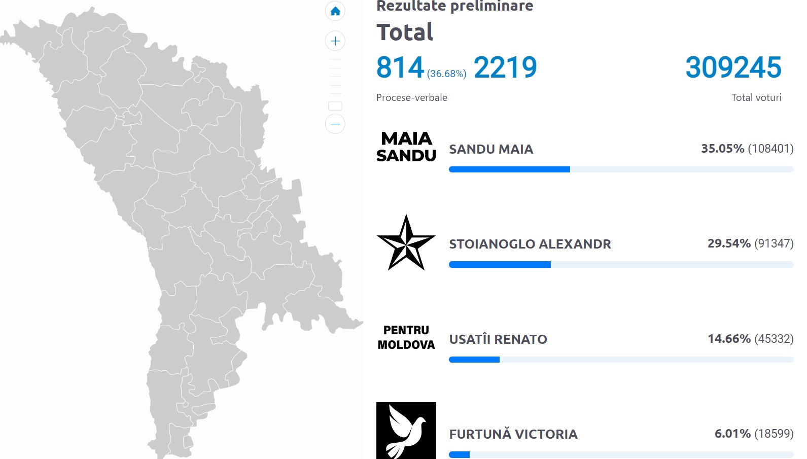 UPDATE 22:45: Primele rezultate parțiale o arată câștigătoare pe Maia Sandu, care conduce cu peste 35%. Pe locul 2 se clasează Alexandr Stoianoglo, cu 29.54 de procente dintre voturile exprimate.