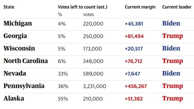 În patru state americane, numărul de voturi rămase de numărat se află sub 10%: Wisconsin, Georgia, Carolina de Nord și Michigan. Dintre acestea, Trump deține un avantaj considerabil în Georgia și Carolina de Nord. Rezultatele din Wisconsin și Michigan sunt mult mai strânse, potrivit The Guardian.