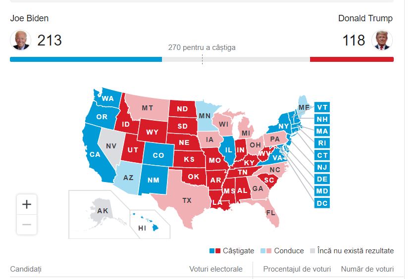 UPDATE - 14.30. În acest moment, Joe Biden are asigurate 224 de voturi electorale (electori) din totalul necesar de 270, în timp ce Donald Trump se află la un număr de 213, potrivit CNN.