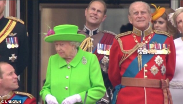 Intregistrarea cu membrii Casei Regale au devenit virale pe internet. Printul era aplecat si vorbea cu fiul sau, printul George, in momentul defilarii Royal Air Force. Regina, imbracata in verde, il bate pe umar si ii spune sa se ridice.