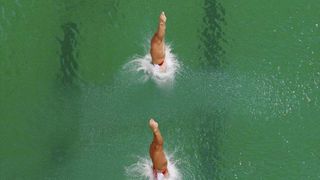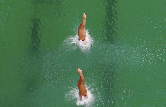Apa uneia dintre piscinele de la Centrul Acvatic Maria Lenk unde au avut loc probele de sarituri in apa sincron, de la platforma de 10 metri a devenit marti verde, dupa ce luni apa avea culoarea albastra.