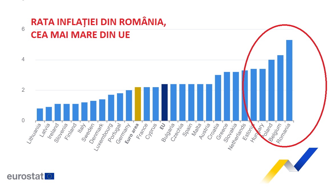 La polul opus, ţările membre UE cu cele mai ridicate rate ale inflaţiei au fost România (5,3%), Belgia (4,3%) şi Polonia (4%).