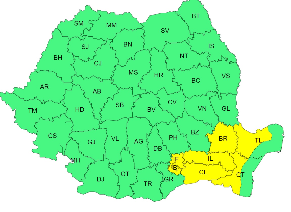 Meteorologii au emis un cod galben pentru temperaturi ridicate și disconfort termic ridicat, care vizează Oltenia, Muntenia și Dobrogea. Avertizarea este în vigoare pe parcursul zilei de sâmbătă, 20 iulie.