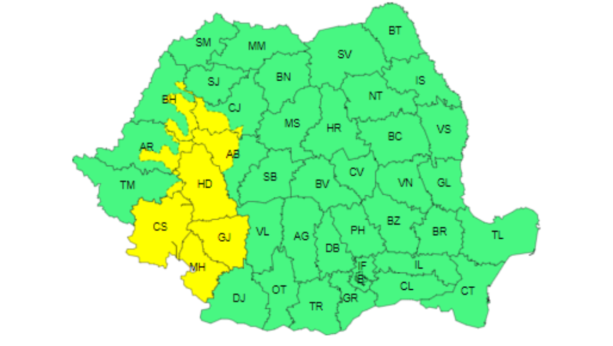 Administrația Națională de Meteorologie a emis un cod galben de ploi. Se pare că vremea se va strica în nouă județe din țară. Sunt așteptate precipitații și rafale de vânt, iar regiunile afectate vor fi sudul Banatului, sud-vestul Transilvaniei, nord-vestul Olteniei, precum și în Carpații Occidentali și vestul Carpaților Meridionali.