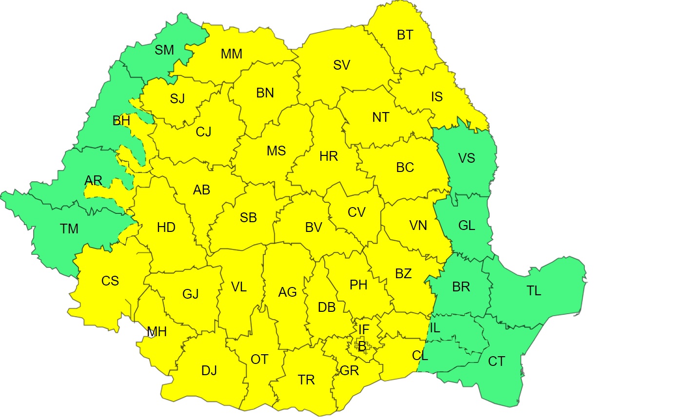 În același timp, meteorologii au emis un cod galben de instabilitate atmosferică care intră în vigoare luni seară, începând cu ora 20:00, și care este valabil până pe data de 2 iulie, la ora 10:00.
