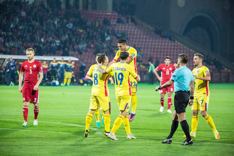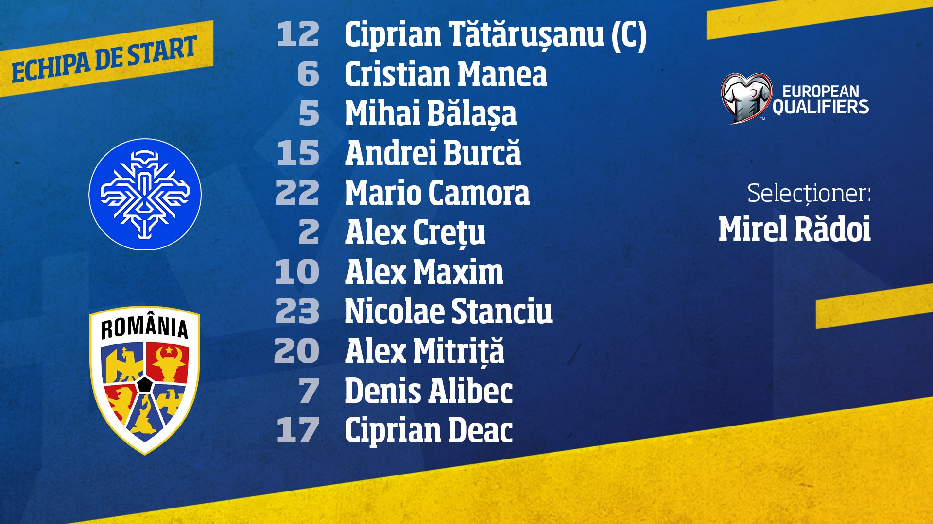 Echipa de start a României este alcătuită din Tătărușanu- Manea, Bălașa, Burcă, Camora- Stanciu, Crețu, Maxim- Deac, Alibec, Mitriță.