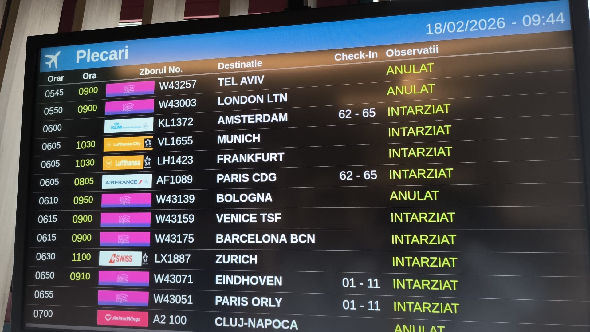 Din cauza condiţiilor meteo, au fost anulate cursele LOT 643/644 Varşovia – Bucureşti – Varşovia, Tarom RO 210 Chişinău – Bucureşti şi Tarom 810 Suceava – Bucureşti.
