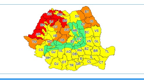 ”Joi (30 iunie) şi vineri (01 iulie), în zonele joase din judeţele Arad, Bihor, Satu Mare, Sălaj, Maramureş şi Bistriţa-Năsăud se vor înregistra temperaturi maxime extreme, ce vor atinge şi depăşi recordurile absolute ale perioadei. Acestea se vor situa în jurul valorilor de 38...39 de grade în judeţele Arad, Bihor şi Satu Mare, iar în Sălaj, Maramureş şi Bistriţa-Năsăud vor fi 36...37 de grade”, anunţă ANM.