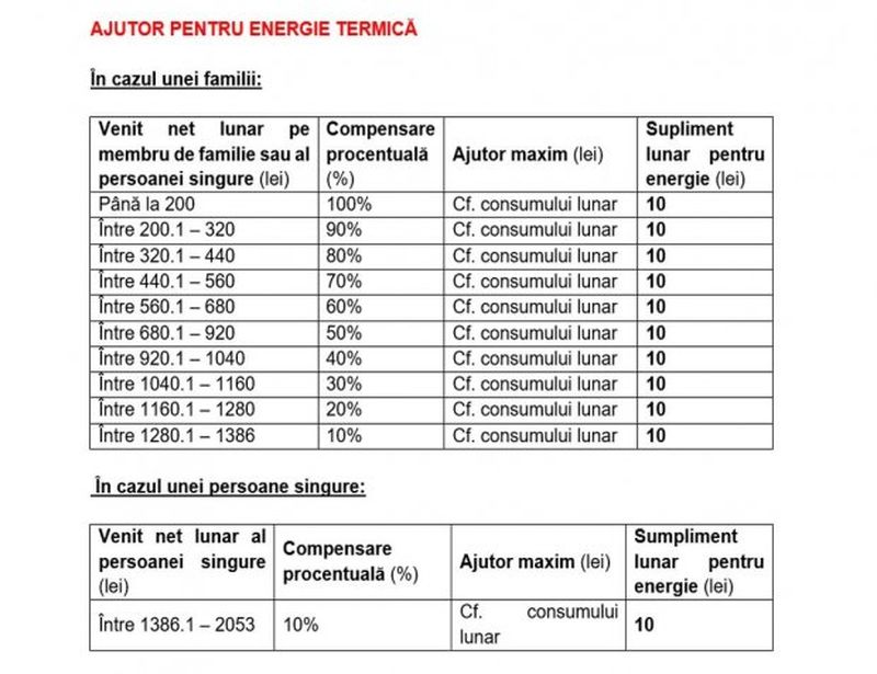 „Ajutorul pentru încălzire se va acorda pentru sursa principală utilizată (ex: energie termică, gaz metan, energie electrică, combustibili solizi sau gazoşi), iar suplimentele de energie se vor acorda pentru acoperirea integrală sau, după caz, a unei părţi din cheltuielile cu iluminatul locuinţei, susţinerea facilităţilor de gătit şi asigurarea apei calde în locuinţă, asigurarea continuităţii în alimentare a echipamentelor electrice de